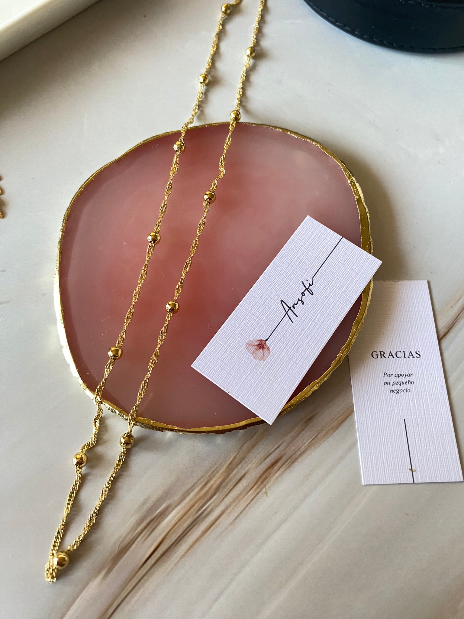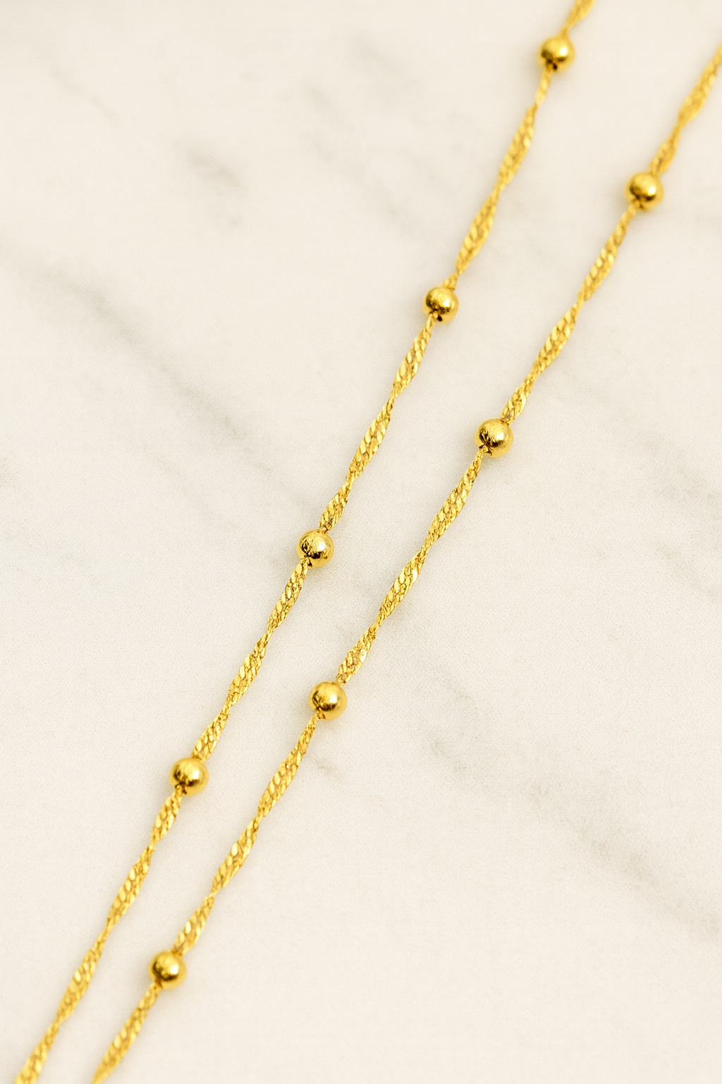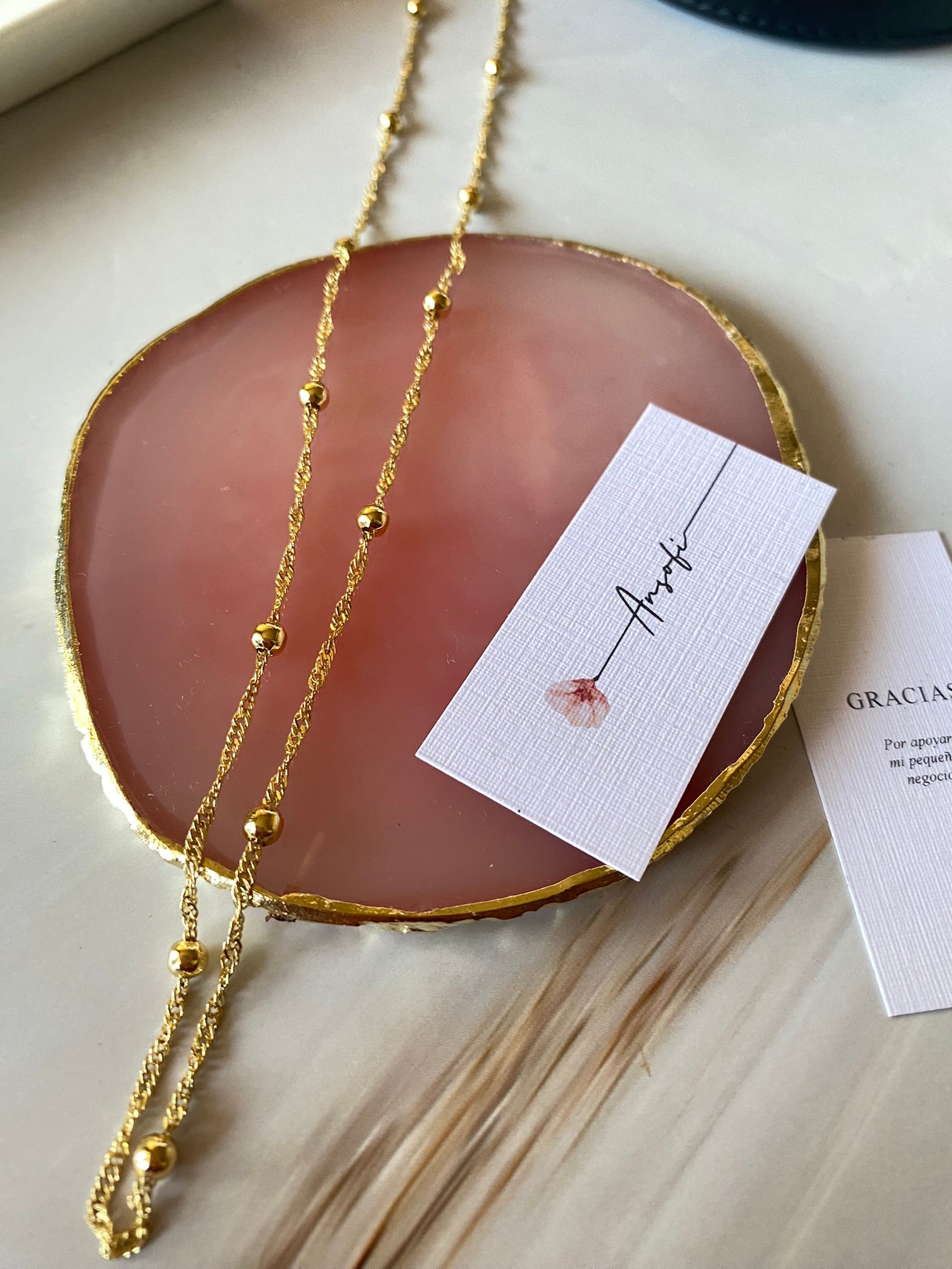 Cadena de acero bañada en oro con esferas texturadas. Movimiento suave con toque cálido. Largo: 45 cm.